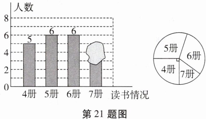 21. 某校要求学生每人每学期读4~7册书,并随机抽查了本学期学生读课外书册数的情况,绘制成如图所示的条形图和不完整的扇形图,其中条形图被墨迹遮盖了一部分.