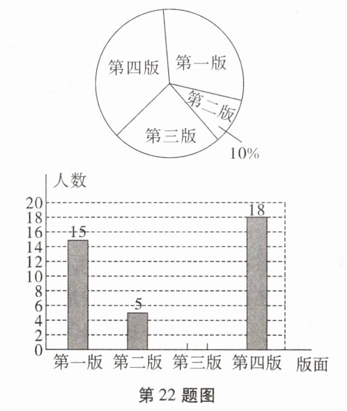 22. 某校园文学社为了解本校学生对本社一种报纸四个版面的喜欢情况,随机抽取部分学生做了一次问卷调查,要求学生选出自己最喜欢的一个版面,将调查数据进行了整理,绘制成如图所示的两幅统计图(不完整).