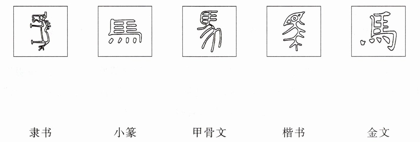 从左往右依次是:甲骨文、隶书、小篆、金文、楷书。