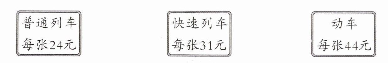 已知普通列车每张$24$元,快速列车每张$31$元,动车每张$44$元,$24\lt31\lt44$,所以选择普通列车车票。