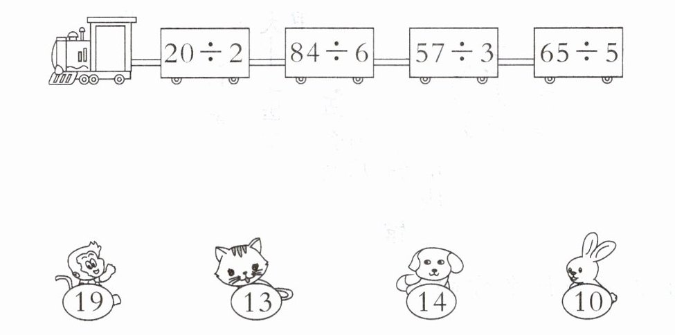 【解析】:分别计算每个除法算式的结果,$20÷2 = 10$,$84÷6 = 14$,$57÷3 = 19$,$65÷5 = 13$,再与小动物下的数字进行连线。
