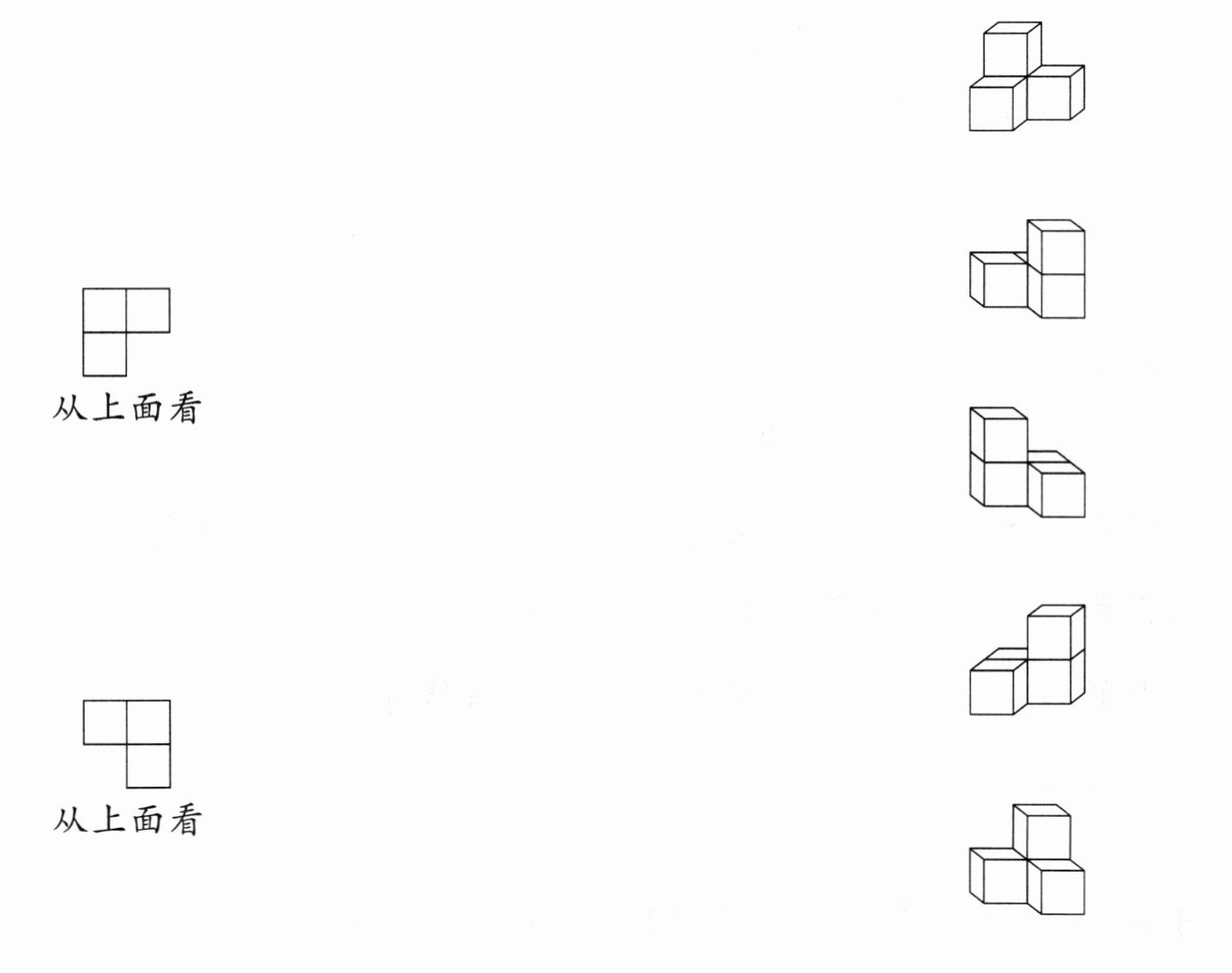 【答案】:第一个从上面看的图连第一行第二个立体图;第二个从上面看的图连第一行第四个立体图。