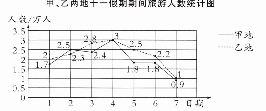 2. 下面是去年甲、乙两地十一假期期间旅游人数的统计图。
