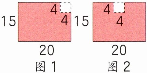 6.在2张长20厘米、宽15厘米的长方形纸片上,分别剪去一个正方形。剩下部分的周长分别是多少?剩下部分的面积呢?