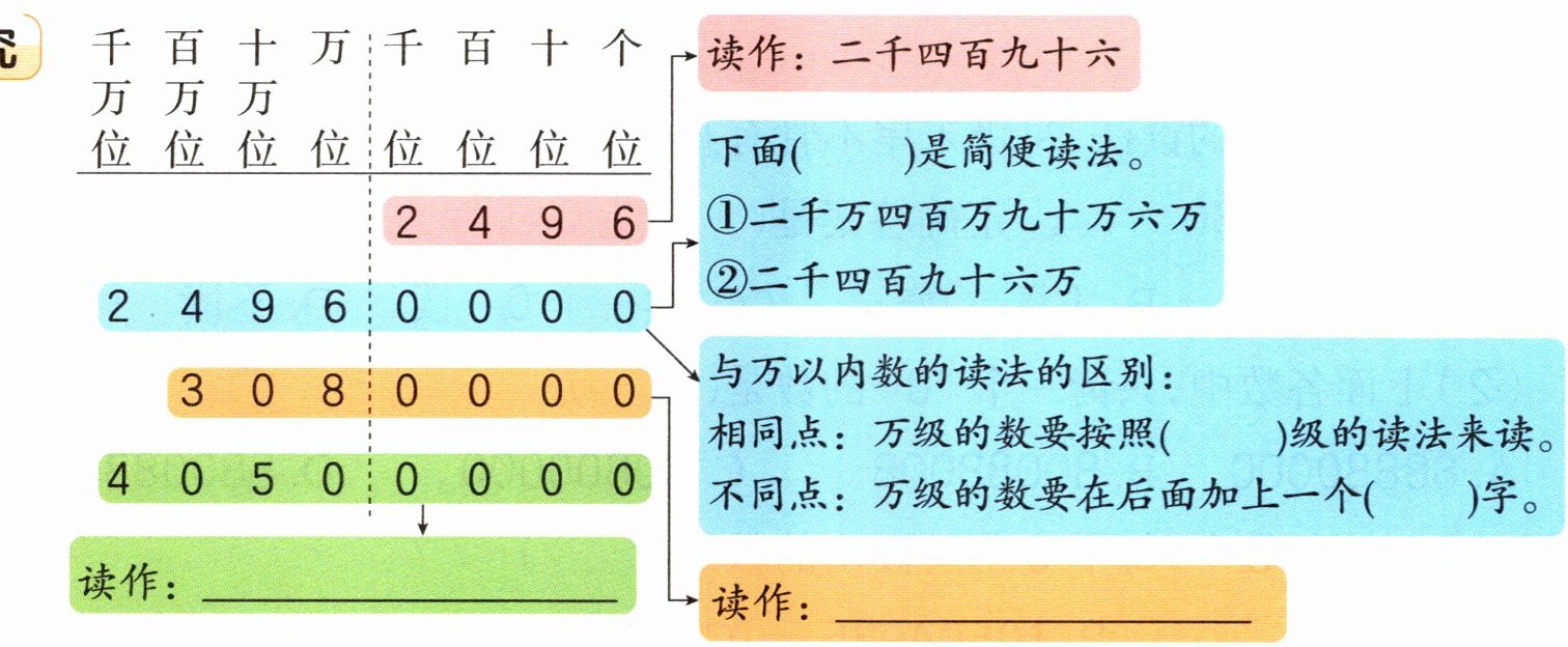 [典例1] 读出各数:2496 24960000 3080000 40500000。