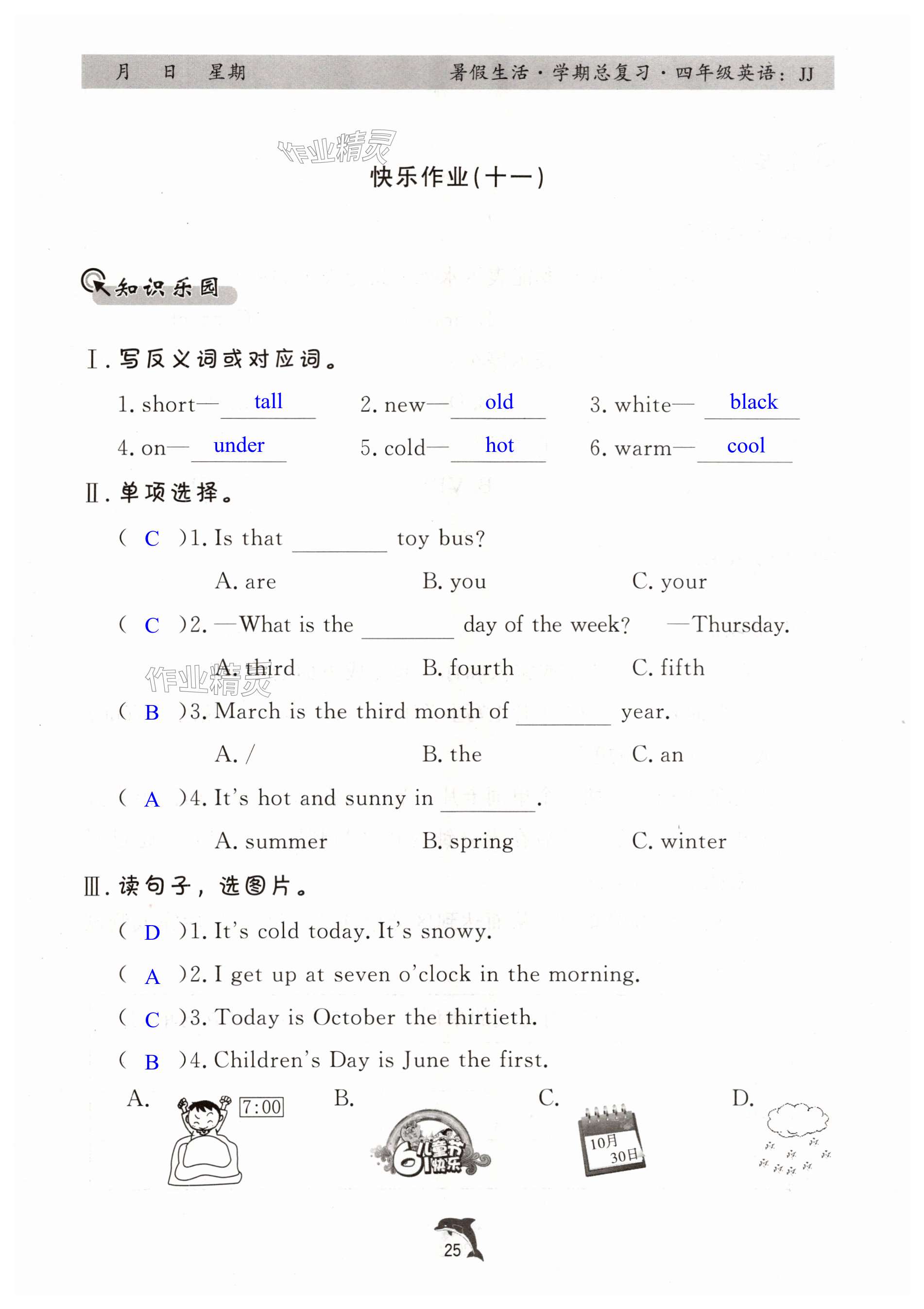 注:目前有些书本章节名称可能整理的还不是很完善,但都是按照顺序排列的,请同学们按照顺序仔细查找。练习册 2025年暑假生活学期总复习四年级英语冀教版 答案主要是用来给同学们做完题方便对答案用的,请勿直接抄袭。