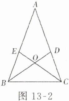 2. 如图13 - 2,在$\triangle ABC$中,$AB = AC$,$BD$、$CE$分别平分$\angle ABC$、$\angle ACB$,并且$BD$、$CE$相交于点$O$,请问$\triangle OBC$是什么三角形?并说明理由.