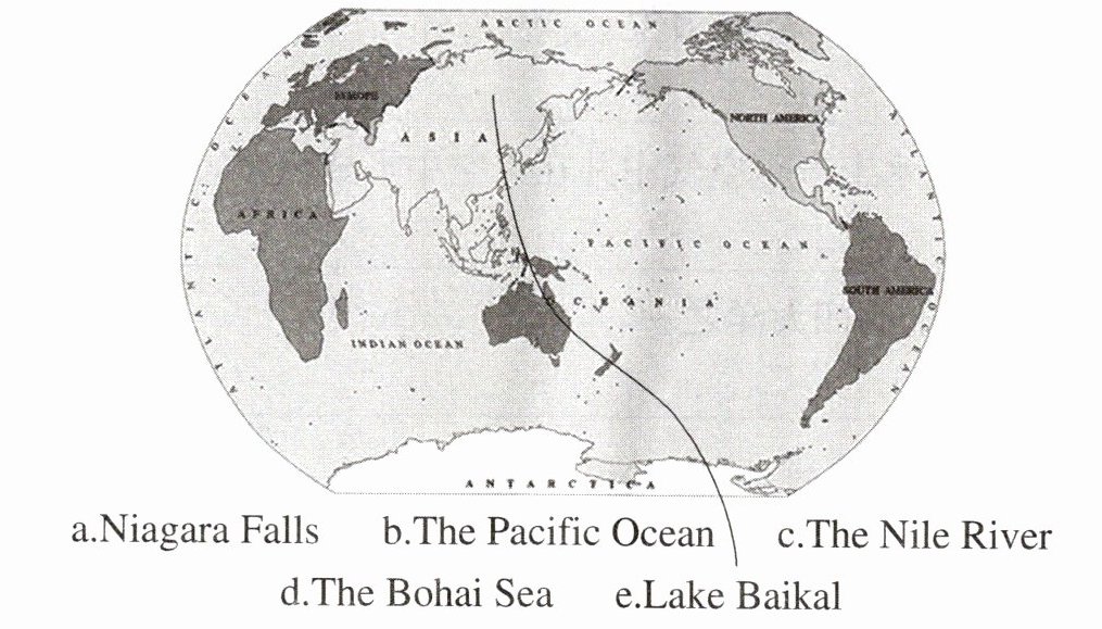 a连尼亚加拉瀑布;b连太平洋;c连非洲;d连渤海;e连贝加尔湖