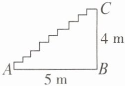 解:将楼梯水平方向的线段向上平移,竖直方向的线段向右平移,可得地毯的长度等于水平方向总长度与竖直方向总长度之和。由图可知,水平方向总长度为 $5m$,竖直方向总长度为 $4m$,所以地毯长为 $4 + 5 = 9(m)$。
