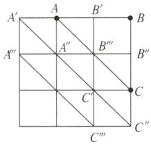 4. 将格点三角形 ABC 在方格图中平移,最多能得到多少个不同位置的格点三角形? 在图中画出平移后的图形.