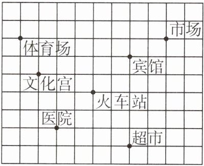 解:火车站$(0,0)$,宾馆$(2,2)$,市场$(4,3)$,文化宫$(-3,1)$,体育场$(-4,3)$,医院$(-2,-2)$,超市$(2,-3).$