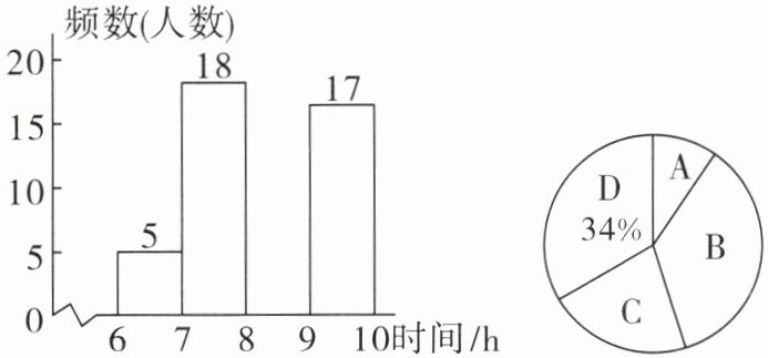 3. 为了解某校学生的睡眠情况,该校数学小组随机调查了部分学生一周的平均每天睡眠时间.设每名学生的平均每天睡眠时间为xh,结果共分为四组:A.6≤x<7,B.7≤x<8,C.8≤x<9,D.9≤x≤10,将调查结果绘制成如图所示的两幅不完整的统计图.
