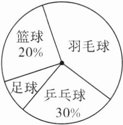 由扇形统计图知:乒乓球占比$30\%$,篮球占比$20\%$,则$30\% + 20\% + x + 4x = 1$,解得$x = 10\%$,故羽毛球占比$40\%$。