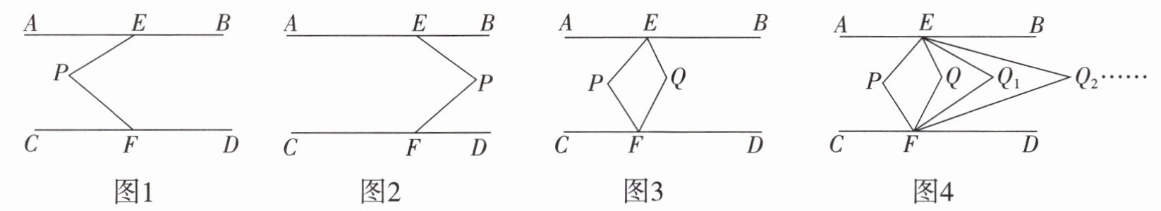 (3)问题拓展:在(2)条件下,如图4,若$∠BEQ$与$∠DFQ$的平分线相交于点$Q_{1}$,$∠BEQ_{1}$与$∠DFQ_{1}$的平分线相交于点$Q_{2}$,$∠BEQ_{2}$与$∠DFQ_{2}$的平分线相交于点$Q_{3}$,…,以此类推,直接写出$∠EPF$与$∠EQ_{2024}F$满足的数量关系.