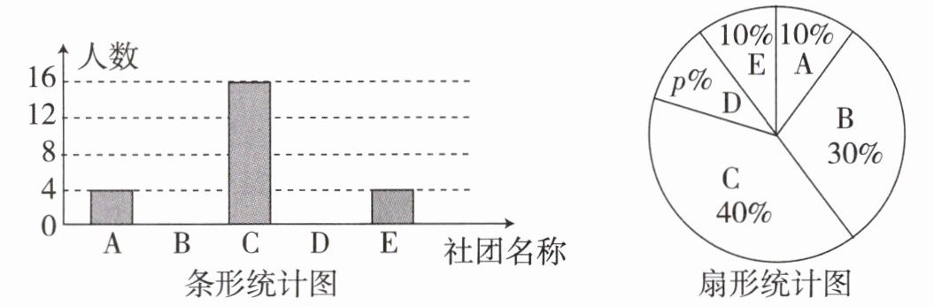 $D$社团人数$n = 40 - 4 - 12 - 16 - 4 = 4$,则$p\%=\frac{4}{40}×100\% = 10\%$,即$p = 10$。