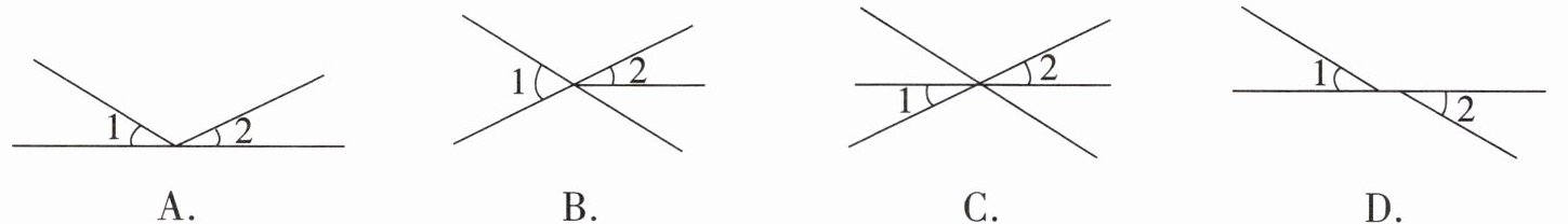 1. 下列各图中,$∠1$与$∠2$是对顶角的为( )