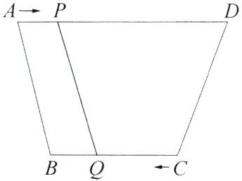解:设 t s 后,四边形 APQB 为平行四边形,则 AP = t,QC = 2t,BQ = 6 - 2t。因为 AD // BC,所以 AP // BQ,根据一组对边平行且相等的四边形是平行四边形知:AP = BQ,即 t = 6 - 2t,解得 t = 2,当 t = 2 时,AP = BQ = 2 < BC < AD,符合条件。综上所述,2 s 后四边形 ABQP 是平行四边形。