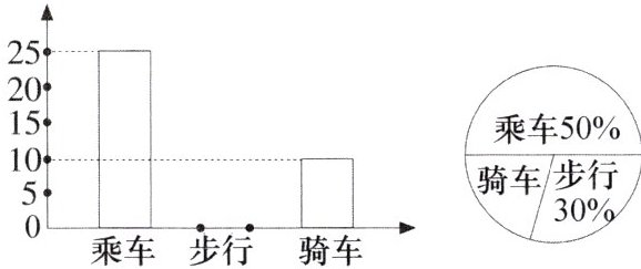 5. 右图是某班全体学生外出时乘车、步行、骑车的人数分布直方图和扇形分布图(两图都不完整),则下列结论中错误的是(