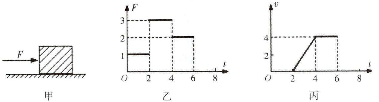 5. 如图甲所示,放在水平地面上的物体,受到方向不变的水平推力F的作用,F的大小与时间t的关系和物体运动速度v与时间t的关系如图乙、丙所示。由图象可知当t=1s时,物体处于