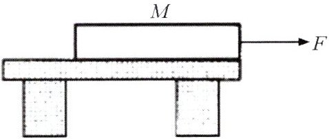 4. 如右图所示,水平桌面上有一长为$L$,质量分布均匀的木板$M$,右端与桌边相齐,在水平力$F$的作用下,沿直线向右匀速离开桌边,在此过程中,下列说法中正确的一项是(