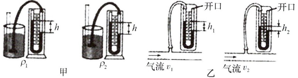 $\rho_{2}$。(2)速度是$v_{1}$和$v_{2}$的气流,分别经过与$U$形管左端相连的管子时,$U$形管液面的高度差如图乙所示,则$v_{1}$