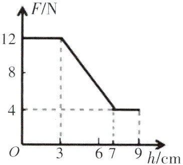 9. 一弹簧测力计下挂一圆柱体,将圆柱体从盛有水的烧杯上方离水面某一高度处缓缓下降,然后将其逐渐浸入水中,如图已给出整个过程中弹簧测力计的示数 F 与圆柱体下降高度 h 变化关系的实验图象,已知$ρ_{水}=1.0×10^{3}kg/m^{3}$,则下列说法中错误的一项是 (
