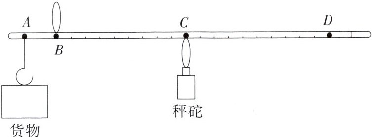 3. 杆秤曾是主要的度量工具,同时它还承载着公平公正的象征意义。某科技小组的同学用轻质细杆制作了一个杆秤,如图所示,$AB = 5cm$,$AD = 55cm$,秤砣的质量为$0.5kg$。使用时将货物挂在秤钩上,用手提$B$处的秤纽,移动秤砣在秤杆上的位置,当秤杆水平平衡时,可读出货物的质量。秤砣最远可移至$D$点。秤杆和秤钩的质量忽略不计。下列说法正确的是 (