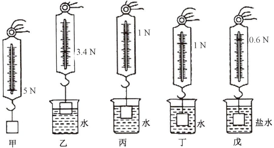 1. 小明用弹簧测力计、圆柱体、两个相同的圆柱形容器,分别装有一定量的水和盐水,对浸在液体中的物体所受的浮力进行了探究,其装置和弹簧测力计示数如下图所示。