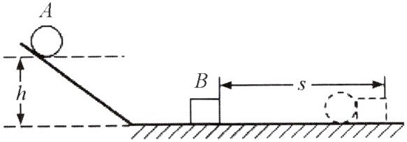 2. 如下图所示,钢球从高$h$处的斜槽上由静止滚下,在水平面上运动,运动的钢球 A 碰上木块 B 后,能将 B 撞出一段距离$s$。再让同一钢球从高$1.5h$处由静止滚下,重复第一次实验。实验表明:质量相同时,钢球的速度越