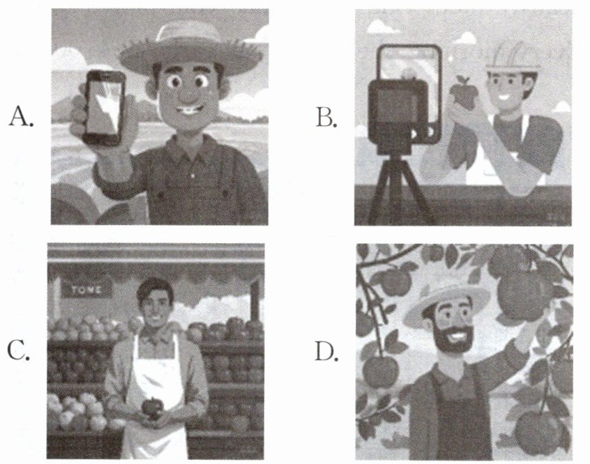 中考新考法 图片理解 Which picture can show the underlined sentence "As he works, he looks at a camera on his phone and tells the onliners what makes apples delicious."?