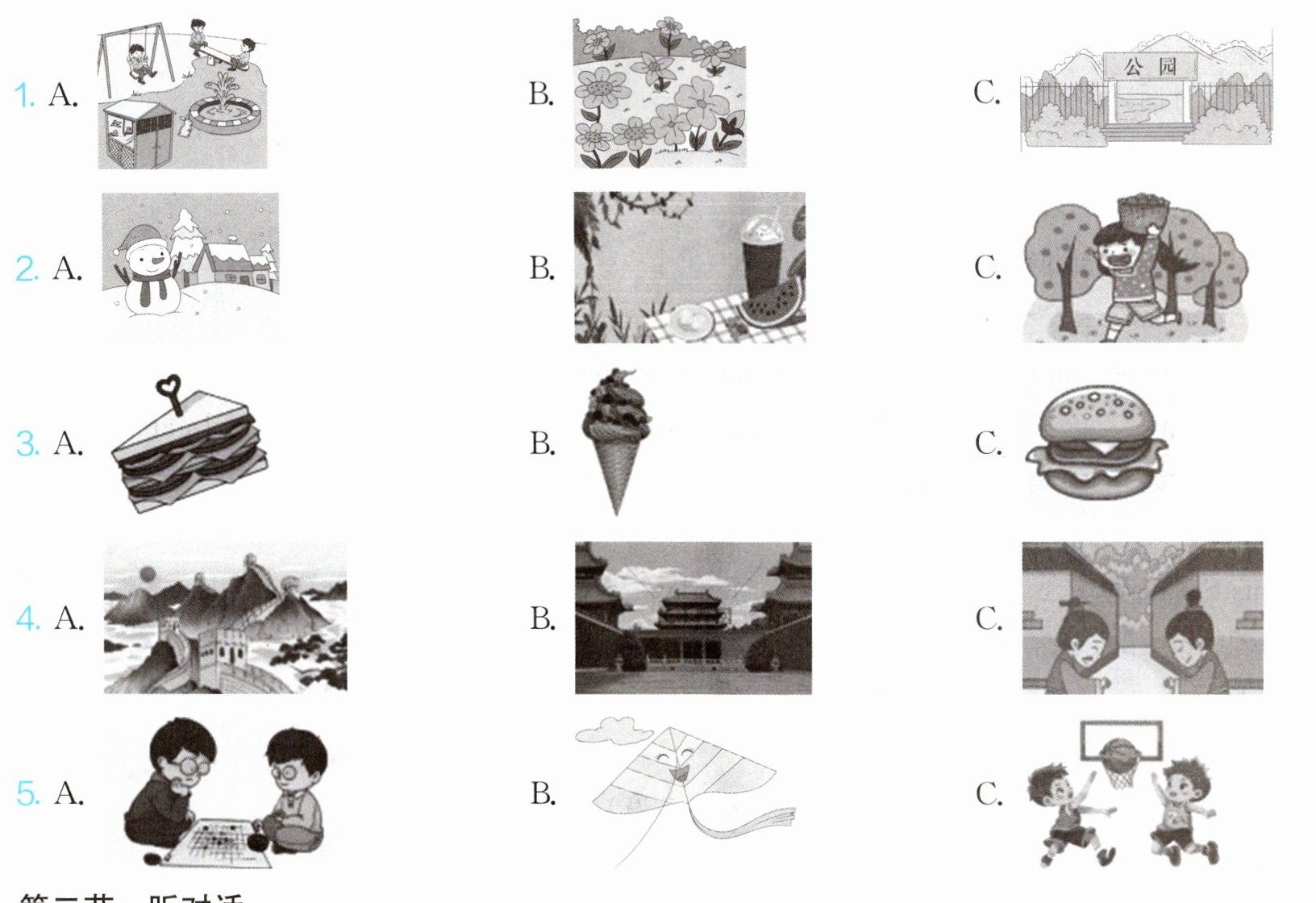 听下面五个句子,从每小题所给的三幅图中选出与其内容相符的选项。(每个句子读两遍)