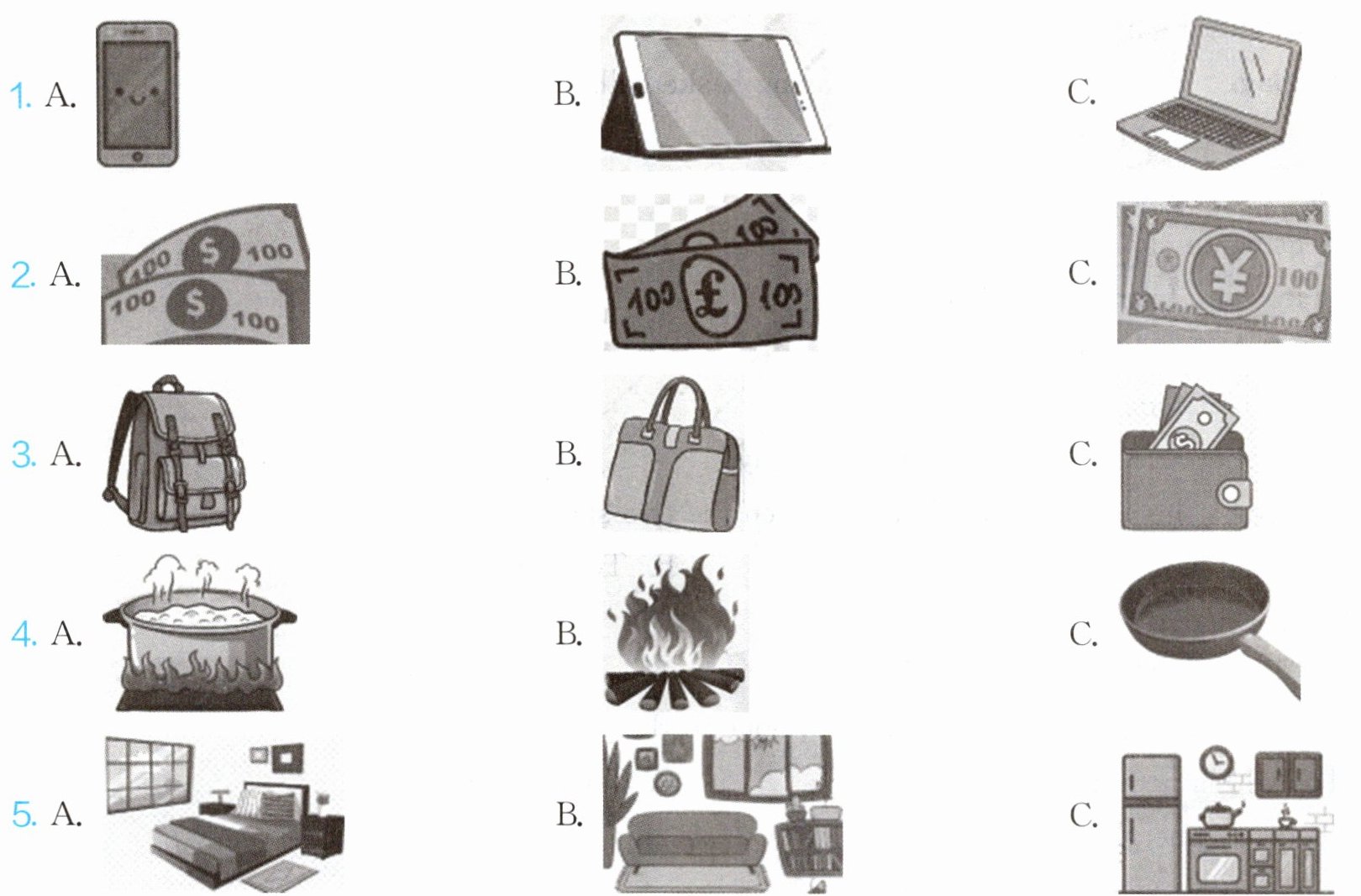 听下面五个句子,从每小题所给的三幅图中选出与其内容相符的选项。(每个句子读两遍)