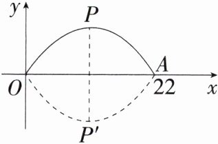 5.新考向地域文化“东津晓月”是安徽寿县八景之一.东津渡在寿县东门外4千米处,旧有一桥,名曰“淝桥”.拂晓漫步桥上,回望寿县古城灯火闪烁,晓月临空,桥下碧水悠悠,波光粼粼,渔火点点,如置身于一幅山水画中.如图,淝桥主桥拱可以近似看作抛物线,桥拱在水面的跨度OA约为22米,若按如图所示的方式建立平面直角坐标系,则主桥拱所在抛物线可以表示为$y= -\frac {13}{121}(x-11)^{2}+k$,求主桥拱最高点P与其在水中的倒影$P'$之间的距离.