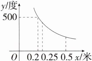 2.「2025安徽六安皋城中学月考」验光师检测发现近视眼镜的度数y(度)与镜片焦距x(米)成反比例关系,y关于x的函数图象如图所示.经过一段时间的矫正治疗后,小雪的镜片焦距由0.25米调整到0.5米,则近视眼镜的度数减少了( )