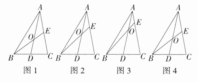 9.新课标推理能力新考向规律探究题如图,在△ABC中,D为BC边的中点,E为AC边上的任意一点,BE交AD于点O,某学生在研究这一问题时,发现了如下结论: