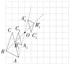 (1)以点O为位似中心画△ABC的位似图形$△A_1B_1C_1,$且$△A_1B_1C_1$与△ABC的相似比为1:2.