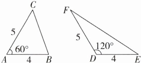 C 【解析】因为AC=DF=5,∠BAC+∠EDF=60°+120°=180°,所以可将△ABC和△DEF拼在一起,如图所示,则点B,D(A),E在同一条直线上.因为AB=DE=4,所以FD为△BEF的边BE上的中线,即△ABC与△DEF等底同高,所以S△ABC=S△DEF,故选C.