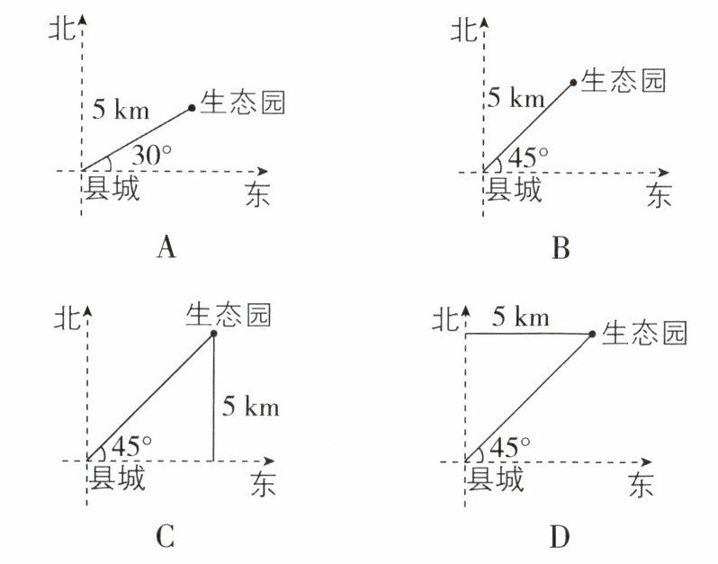 B [解析]因为生态园位于县城东北方向5km处,所以生态园在县城北偏东45°方向5km处.故选B.