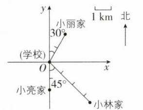 4[2025安徽芜湖质检]小丽家在学校的北偏东30°方向上,距离学校2km处;小亮家在学校的正南方向上,距离学校1.8km处;小林家在学校的东南方向上,距离学校3.6km处.请你建立一个适当的平面直角坐标系,并在坐标系上标出他们三家所在的位置.