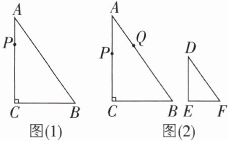 (2)如图(2),在△DEF 中,∠E = 90°,DE = 4 cm,DF = 5 cm,∠D = ∠A. 在△ABC 的边上,若另外有一个动点 Q,从点 A 出发,沿着边 AB→BC→CA 运动,回到点 A 停止. P,Q 两点同时出发,在两点运动过程中的某一时刻,恰好△APQ≌△DEF,求点 Q 的运动速度.