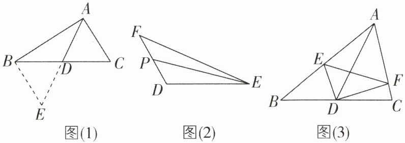 (3)如图(3),AD是△ABC的中线,E,F分别在AB,AC上,且DE⊥DF. 求证:BE+CF>EF.