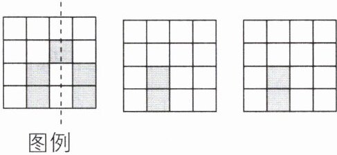 6 [2024 安徽合肥蜀山区期末]如图是 $ 4 × 4 $ 正方形网格,其中有两个小正方形是涂黑的,请再选择三个小正方形涂黑,使整个涂成黑色的图形成为轴对称图形.请补全图形,并且画出对称轴(如图例),要求所画的四种方案不能重复.