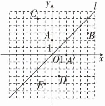 (1)观察图易知 $ A(0,2) $ 关于直线 $ l $ 的对称点 $ A' $ 的坐标为 $ (2,0) $,请在图中分别标明 $ B(5,3) $,$ C(-2,5) $ 关于直线 $ l $ 的对称点 $ B',C' $ 的位置,并写出他们的坐标:$ B' $______,$ C' $______。