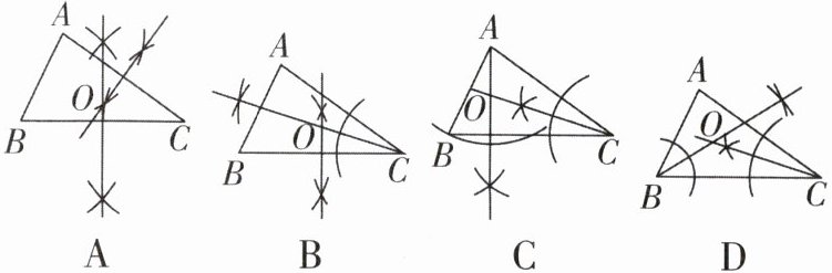 ∴点O为△ABC各个内角的平分线的交点,由各选项的作图痕迹可知,D选项中,点O为∠ABC和∠ACB的平分线的交点,即D选项符合题意.故选D.