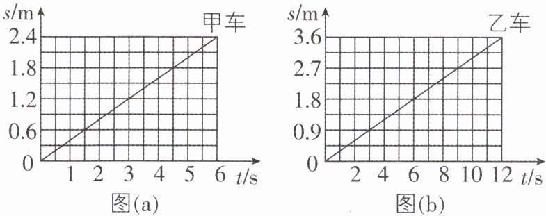 4 [偏难]甲、乙两小车从相距20m的A、B两点同时在同一直线上做匀速运动,它们的s-t图像分别如图(a)(b)所示,速度分别为$v_{甲}$、$v_{乙}$,经过时间t后,两小车相距6m,则t不可能是 (