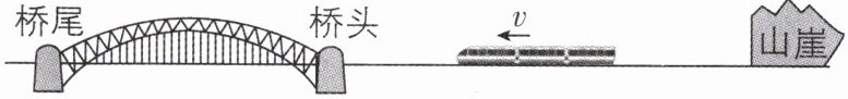 5 [2024陕西商洛期末,中]如图所示,长度为200m的火车从山崖匀速驶向一座大桥,火车在车头距离桥头150m、距离山崖785m处鸣笛,5s后车头到达桥头,同时车头的司机听到来自山崖的回声,火车又用40s完全通过了该大桥,求: