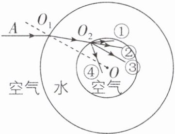 解:光线从空气射入水球(O₁处),折射角小于入射角,折射光线靠近法线O₁O;进入气泡球时,光线从水射入空气(O₂处),法线为O₂O,此时折射角大于入射角,折射光线远离法线O₂O。综合两次折射,进入气泡球的折射光线可能为③。