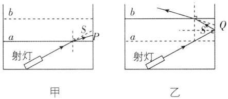 B 【解析】往池内注水,水面升至 a 位置时,光线在水面处发生折射,根据光从水中斜射入空气中时折射角大于入射角画出折射光线,P 点位置如图甲所示,所以 P 点在 S 点的下方。水面升至 b 位置时,光在水中沿直线传播,经水池侧壁反射后,光从水中斜射向空气中,折射角大于入射角,折射光线远离法线,如图乙所示;由图乙可知,人在池旁看到亮斑的位置在 Q 点,即 Q 点在 S 点的上方。