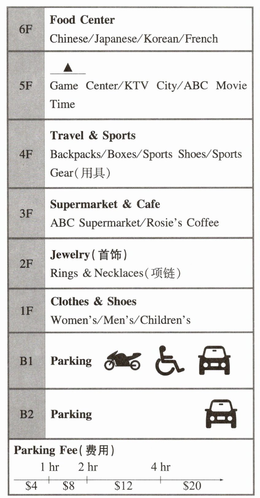 1. D 细节理解题。根据材料中的 6F、5F、4F、3F、2F、1F、B1 和 B2 可知,这个购物中心一共有八层。