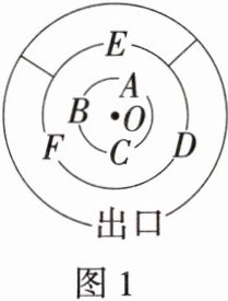 7. 新课标应用意识 某迷宫游戏地图如图1所示,嘉淇从点O出发,只要遇到一扇门就必须从里圈走到外圈,然后随机向左转或向右转后继续行进(如走出A门后,若左拐行进会从E门走出;若右拐行进会从D门走出),且这两种情况可能性相同,规定:走进死胡同就算失败.